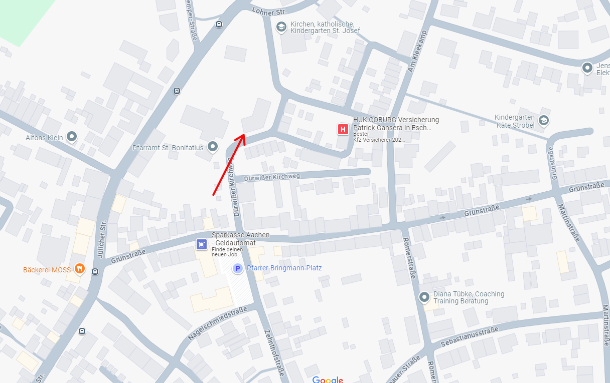 Das Bonifatiusforum befindet sich in 52249 Eschweiler-Dürwiß Bonifatiusstr. 26 . Der Eingang ist aber im Bereich Dürwißer Kirchweg. Von GoogleMap wurde unten ein Screenshoot erstellt. Der Eingang ist genau dort, wo die Spitze des Roten Pfeils hinzeigt.