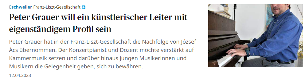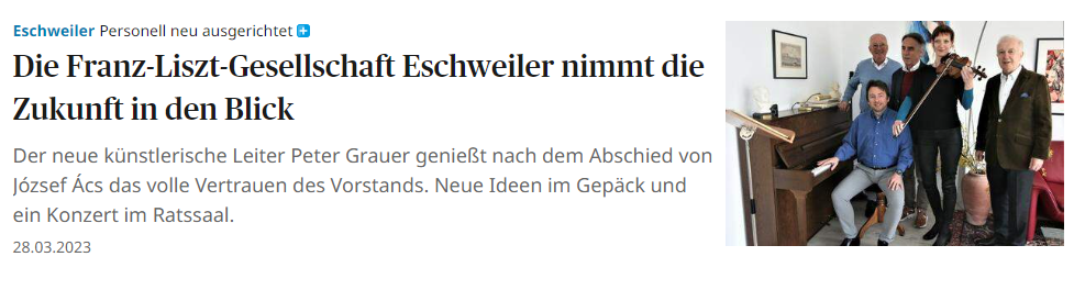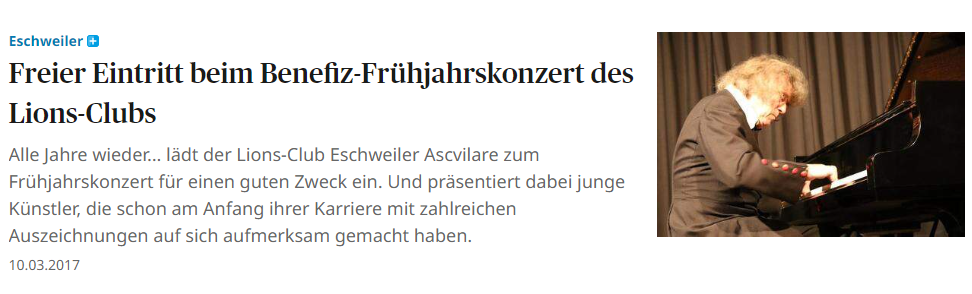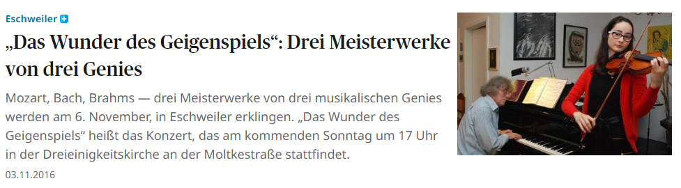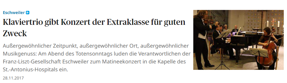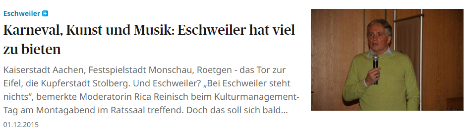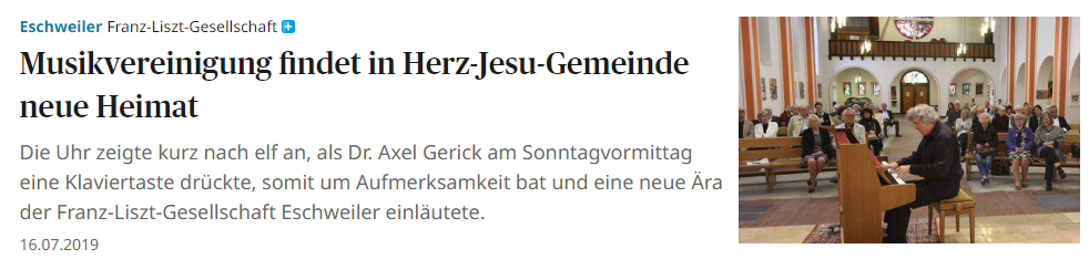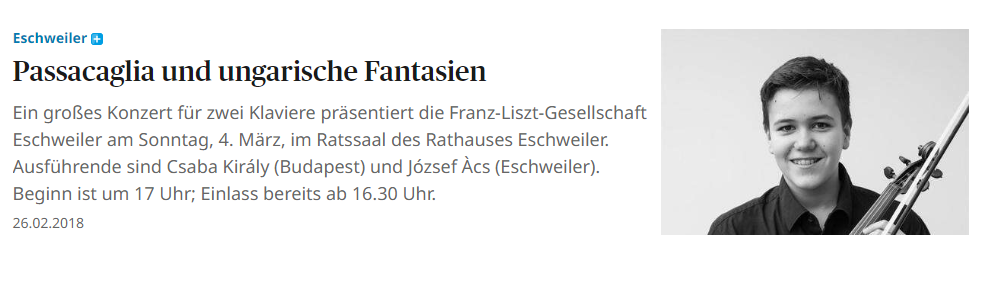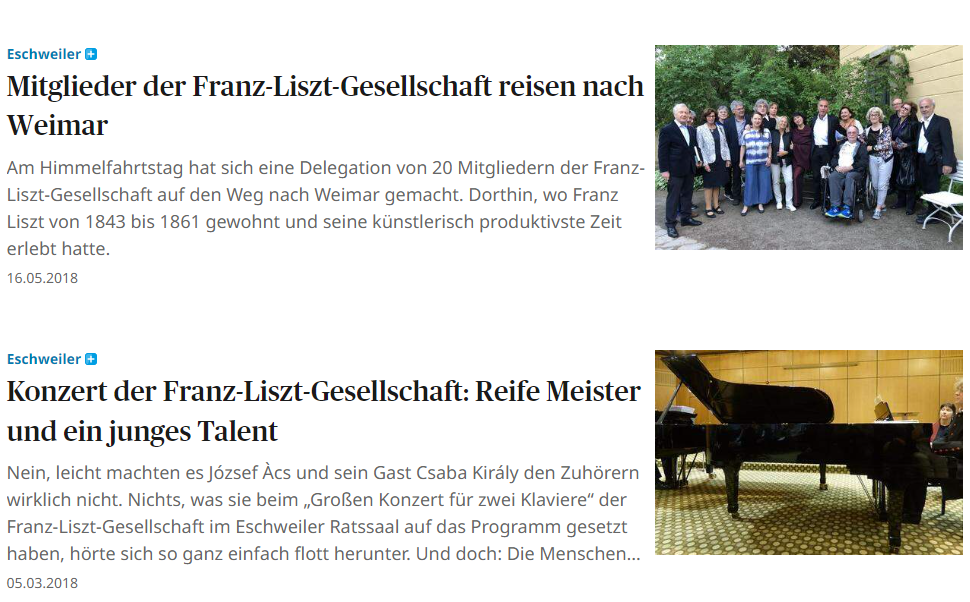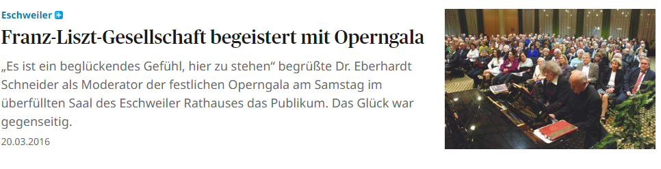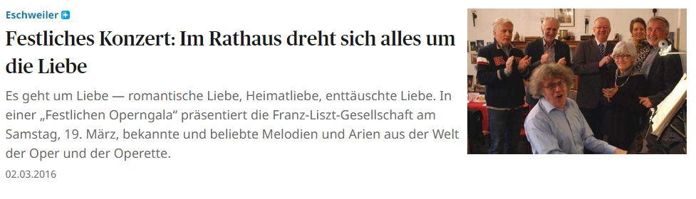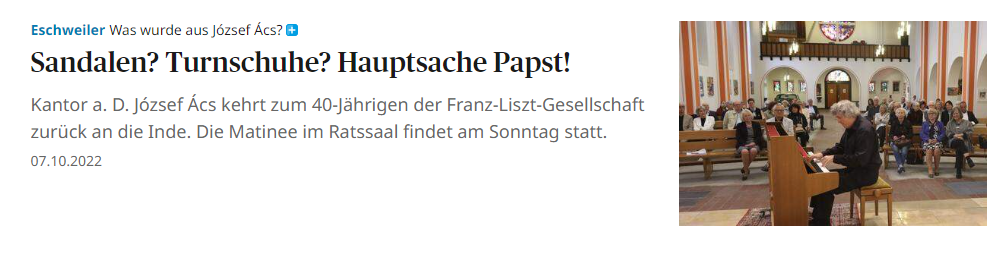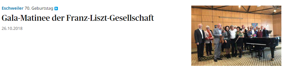 Ein sehr schöner Artikel aus der Eschweiler Zeitung vom 03.11.2015 über Hanni Jantzen soll mal hier komplett zitiert werden. Hanni Jantzen, die Ehefrau von Dr. Othmar Jantzen, der mit Josef Ács die Franz-Liszt-Gesellschaft gründete, war seit den Anfängen dabei. Der Autor des Artikels ist Patrick Nowicki, den ich auf der Fußwallfahrt nach Kevelaer August 2024 als Mitpilger kennenlernen durfte. Er ist im nächsten Jahr 2025 Kandidat der CDU für die Bürgermeisterwahl.